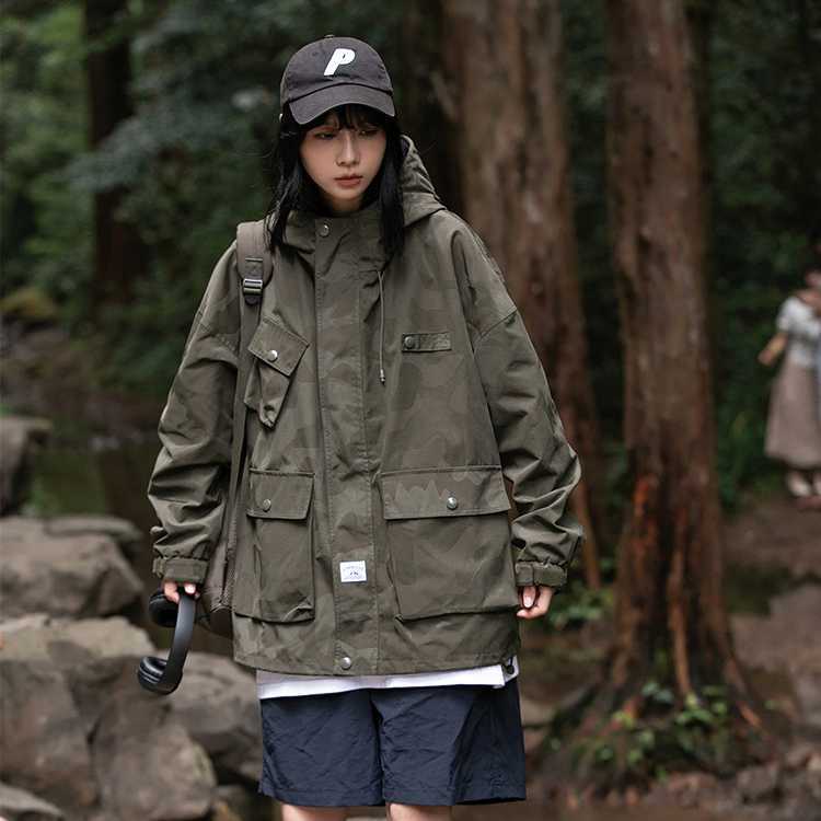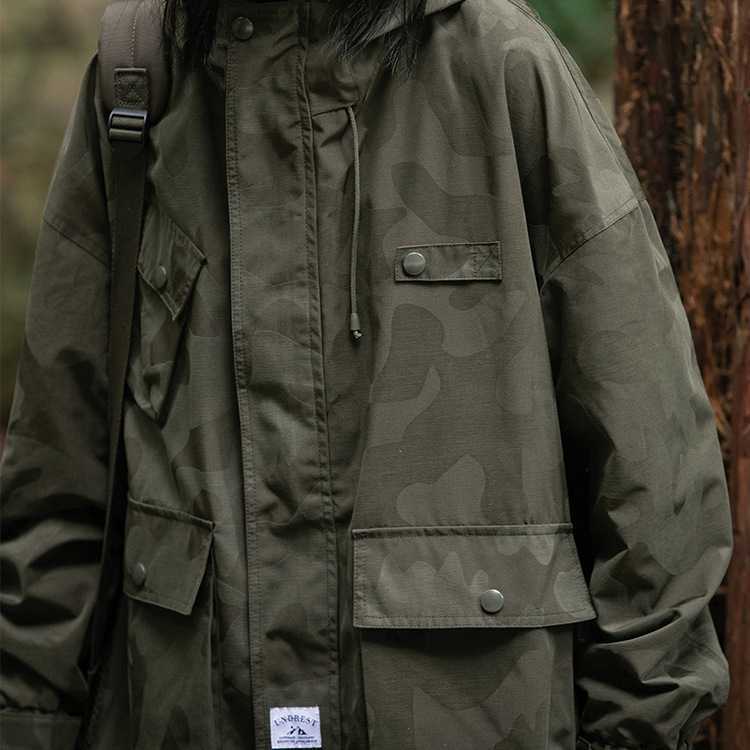 メンズ 迷彩柄マルチポケットフード付きアウトドアジャケット